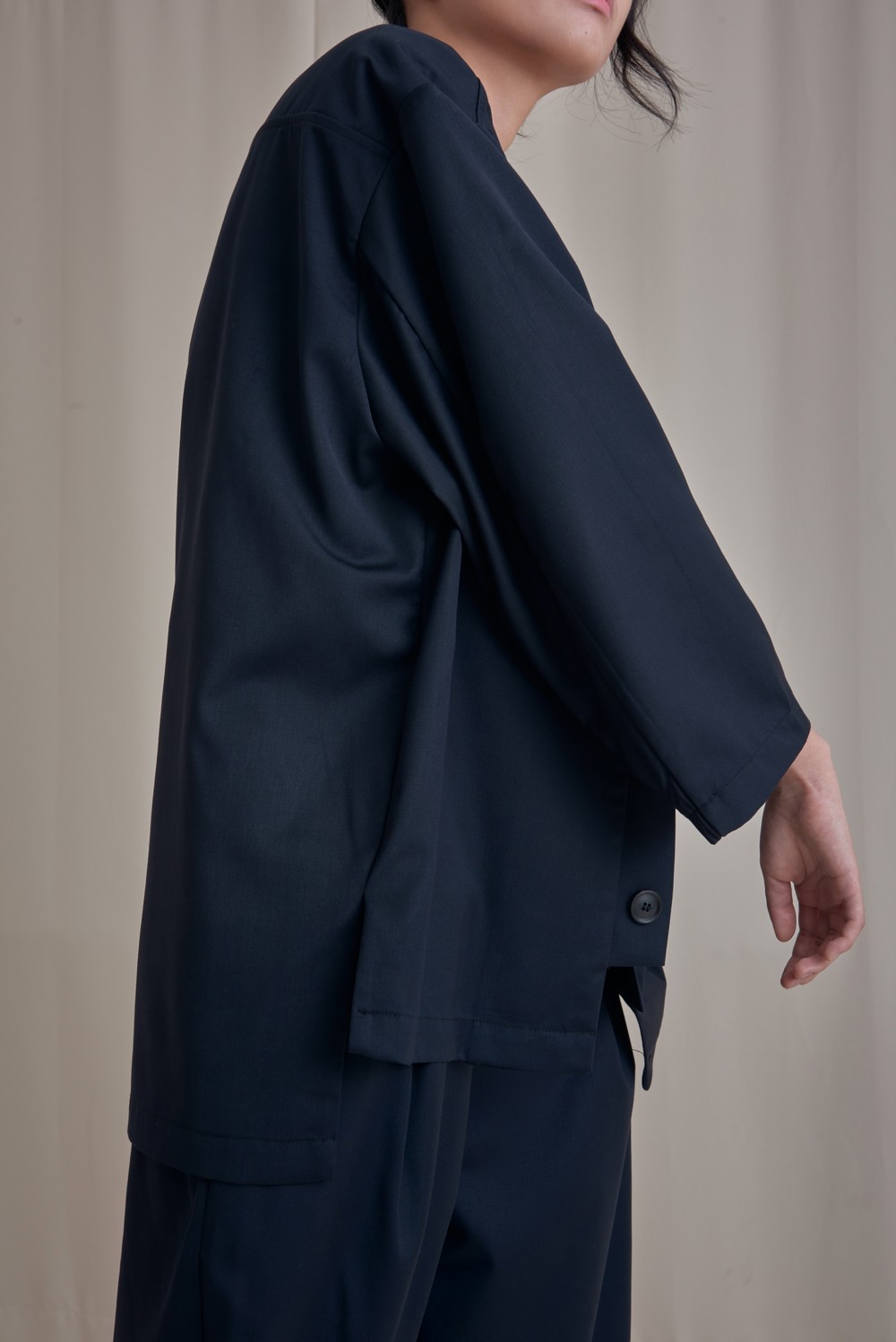 옷의 색감은 사진보다 조금 어두운 네이비컬러이며, 촬영장의 조명과 보정작업으로 어느정도 색감차이는 존재합니다!